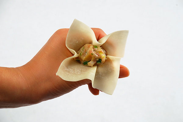 Make a circle with your left thumb and index finger, place a wonton skin over the circle, and place the filling from Step 2 in the middle. Wrap with the wonton skin.