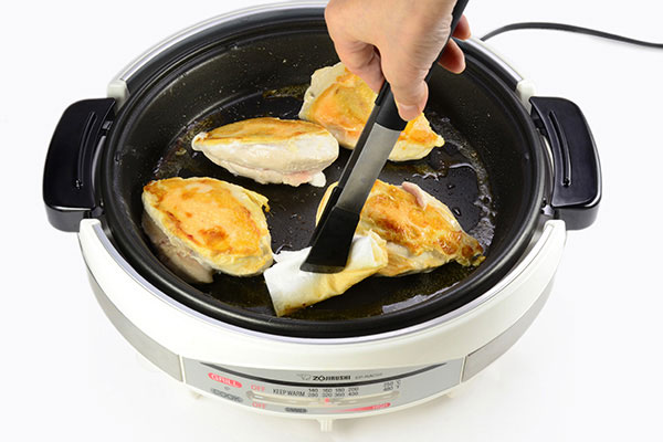Sauté the chicken. Add oil in the deep pan of the Gourmet d'Expert® Electric Skillet. Place chicken, skin side down. Cover with lid and set the temperature to 360ºF.