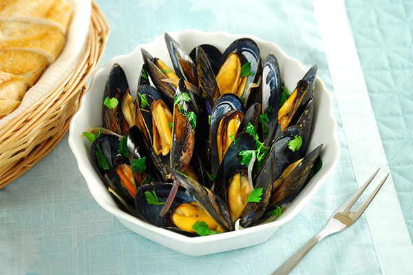 Add the mussels, wine, and half the parsley. Do not stir the mussels, as they may scratch the pan. Bring to a boil, then place the lid on the pan and steam the mussels for about three minutes or until most of the mussels open.