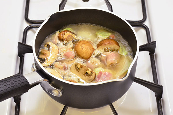 Cut the mushrooms into halves, nappa cabbage and bacon into bite-size pieces.