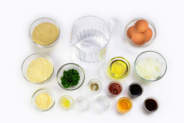When quinoa is cool, add onion, parmesan cheese, salt, pepper, bread crumbs, garlic and parsley to the bowl and mix well. When the mixture is cool to the touch, add beaten eggs and mix well.