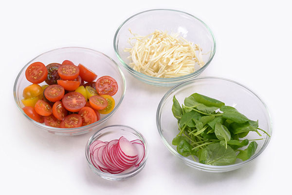 Cut cherry tomatoes into halves, cut watercress and enoki mushroom into bite-size portions. Slice radishes, thinly.