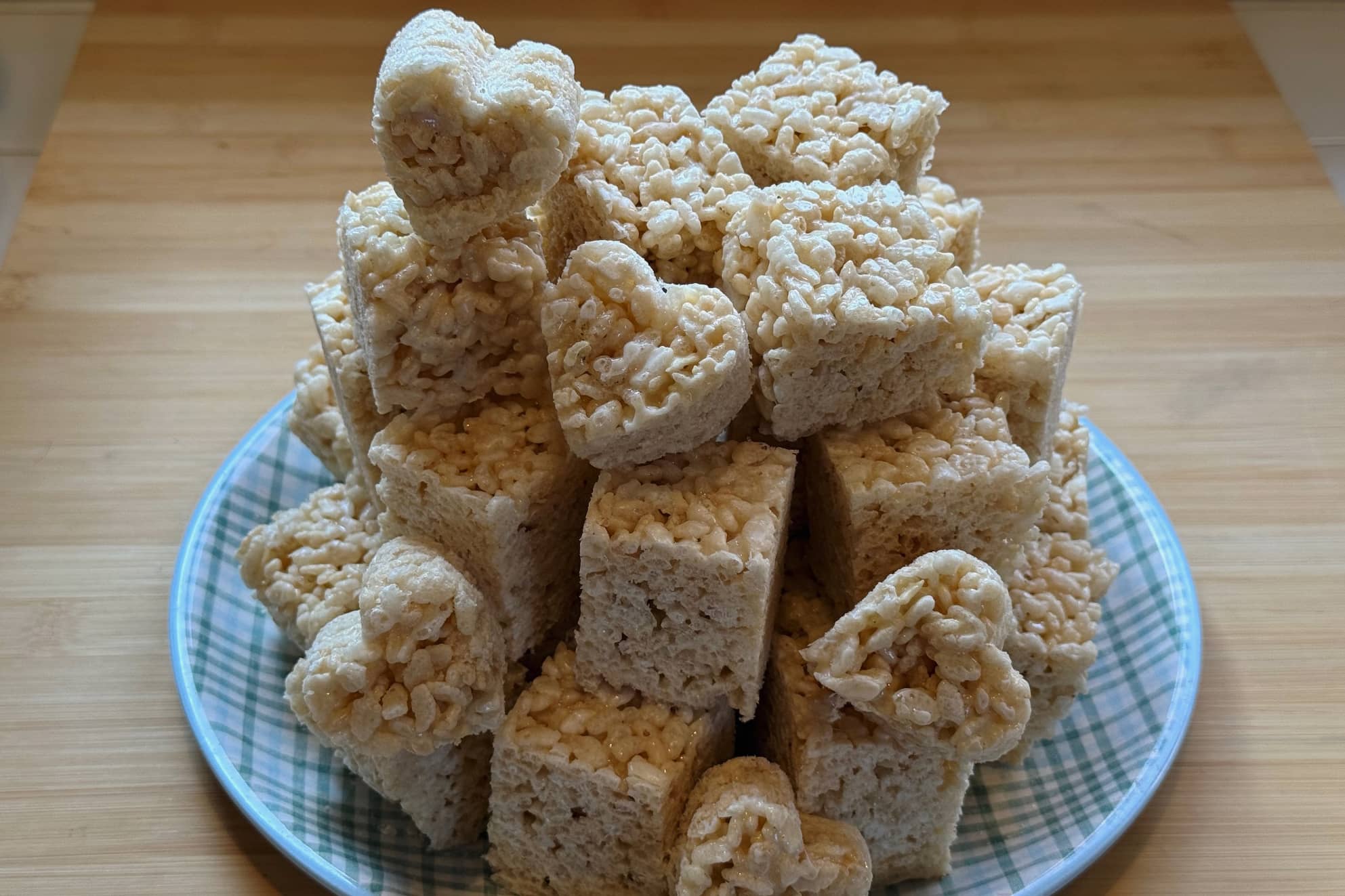 One of the best party treats ever invented—bring this to the office and wish everyone a happy Valentine’s Day. pile of rice krispies treats