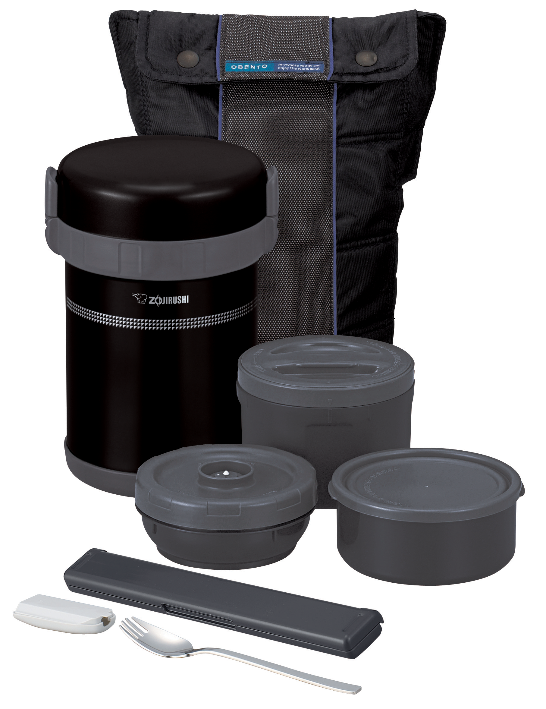 3 inner bowls | Forked spoon + chopsticks | Carrying strap
