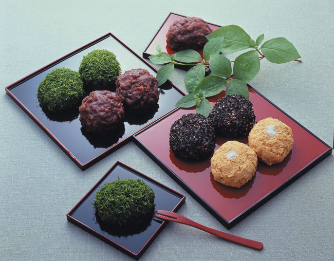 Ohagi (pronounced oh-hah-ghee) is a delicious, traditional Japanese dessert. It consists of a ball of coarse sweet rice covered with a layer of adzuki bean paste or kinako, roasted soybean flour. Typically rice is soaked for 6-12 hours prior to cooking and is prepared similar to mochi. They are commonly eaten during higan periods which are around the spring and autumn equinox. Another type of ohagi is inverted, with the rice on the outside and beans on the inside; these are often coated with a layer of kinako.