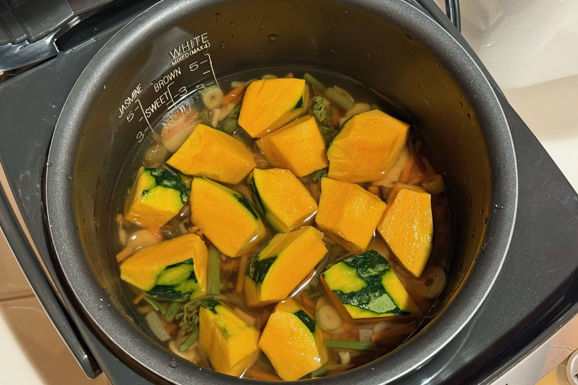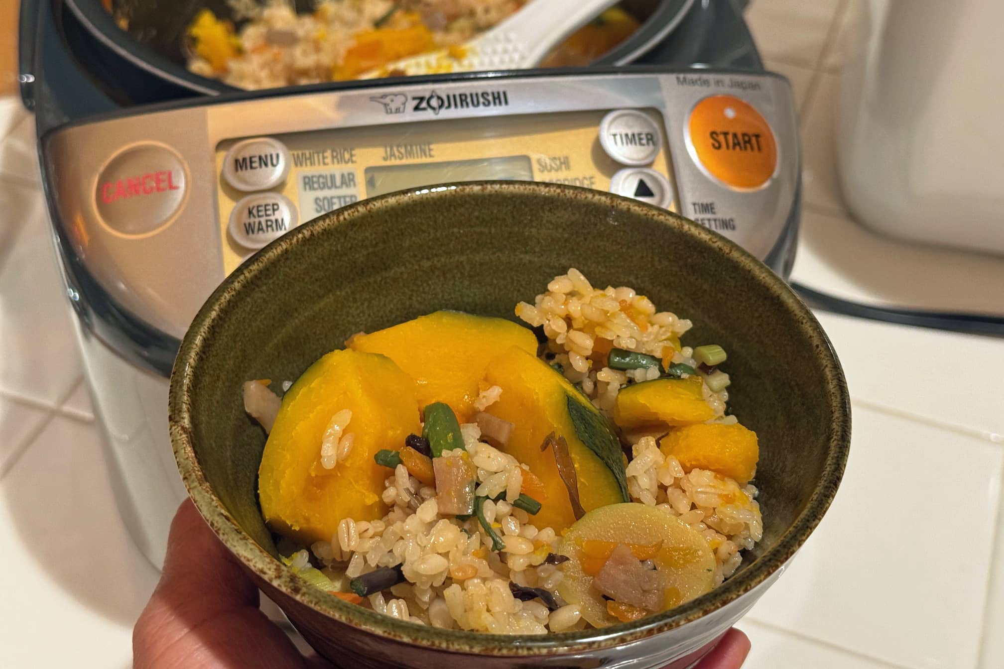 This is so easy—the kit comes with all the ingredients for mixed rice (also known as kamameshi) so all you do is toss everything into the cooker with the rice. Add the kabocha on top, and turn it on. Out comes a healthy, flavorful meal just right for October!