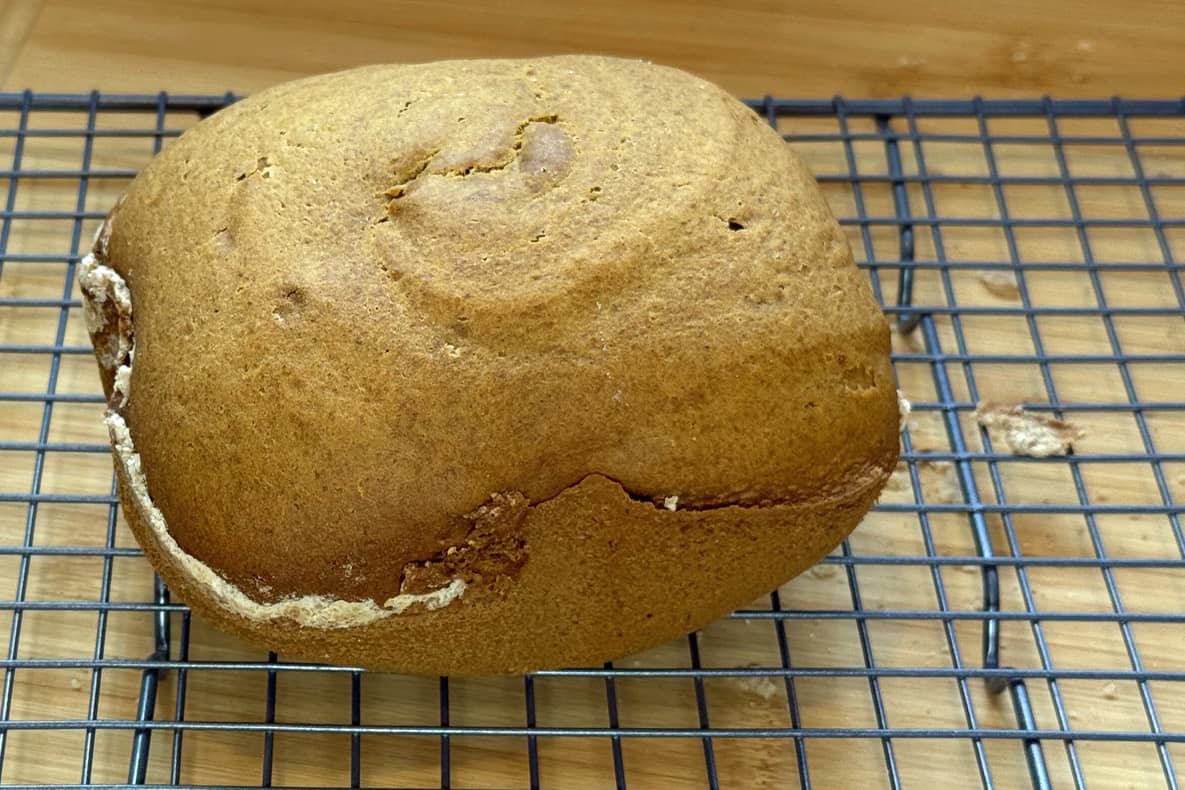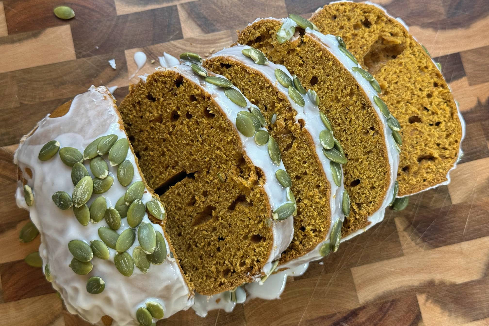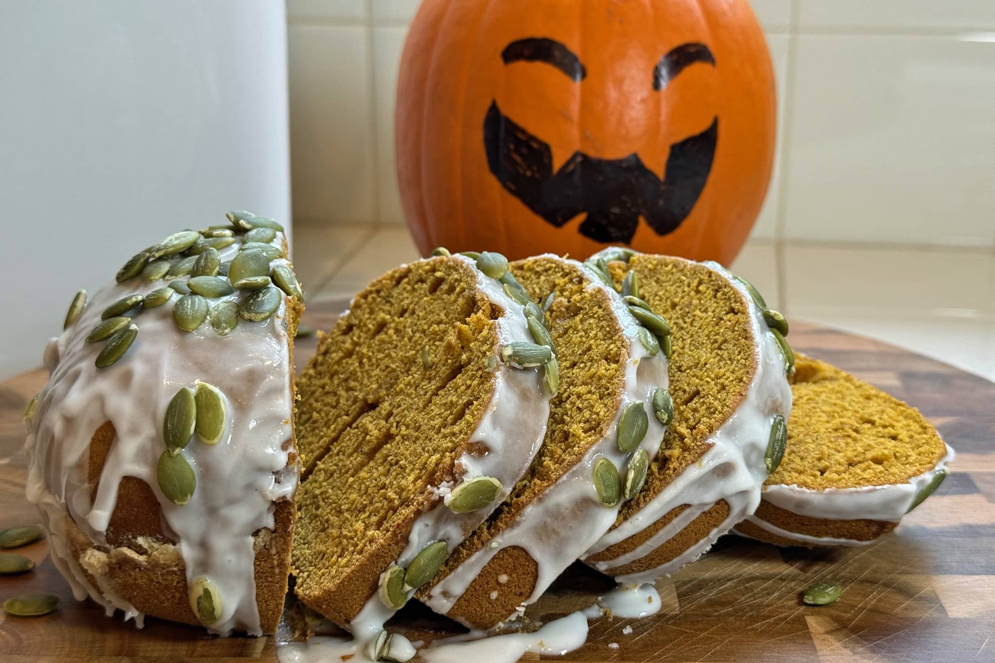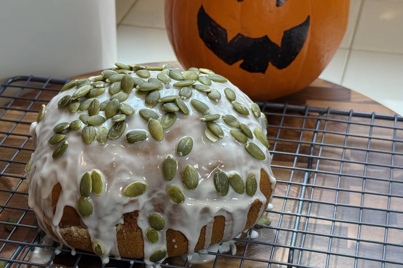 Happy October, people! This month’s pumpkin cake is brought to you by my bread machine, which continues to bake foolproof pound cakes without so much as lifting a spatula. Seriously, you know what makes me happier than something easy to do? When it can be made without buying special ingredients. I used a recipe from Wendy Polisi called “Dump-and-Go Bread Machine Pumpkin Bread” and all I had to buy were the pumpkin seeds because I had everything from the last time I made pumpkin bread.