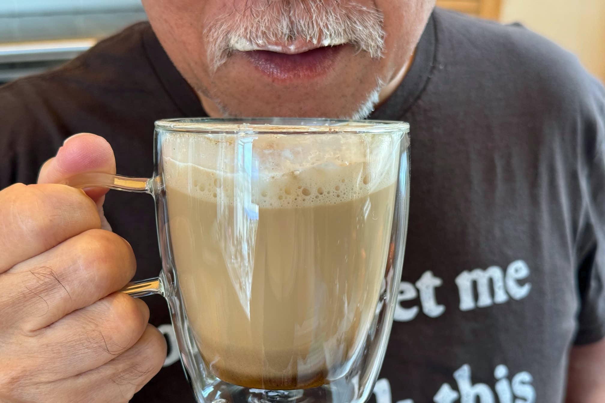 After you steam the milk, the fun part is frothing it to get the foam that goes on top of the latte. I used a gadget that we have at home that my daughter uses all the time to make her matcha lattes.